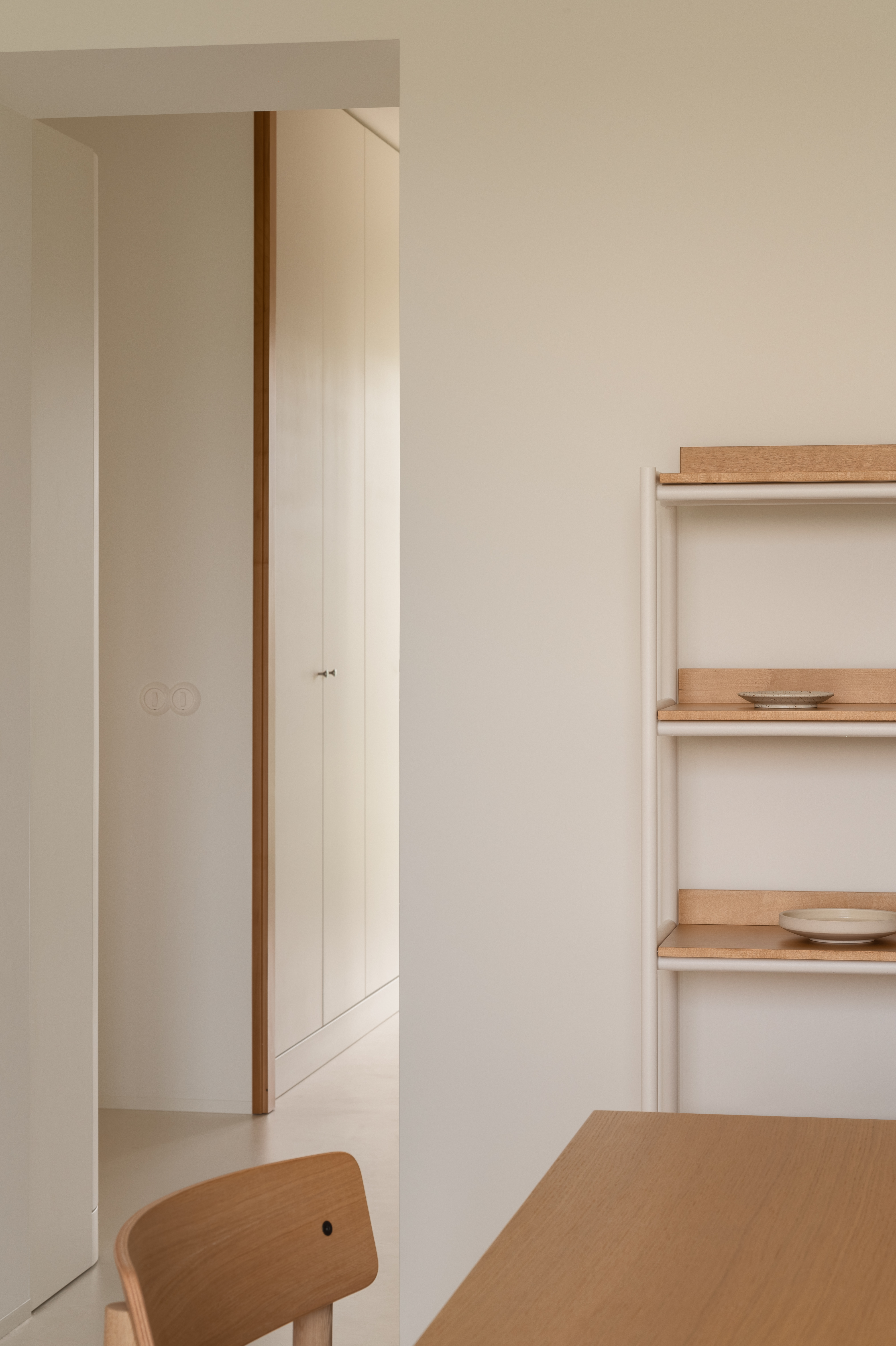 The apartment's owners are ascetic and picky about their own space. It has been reflected in our vision and planning accordingly. We design the apartment in clean, laconic volumes. In general, we formed it in a pastel palette, adding expressive and minimalist accents of colour in certain areas. In the kitchen, for example.